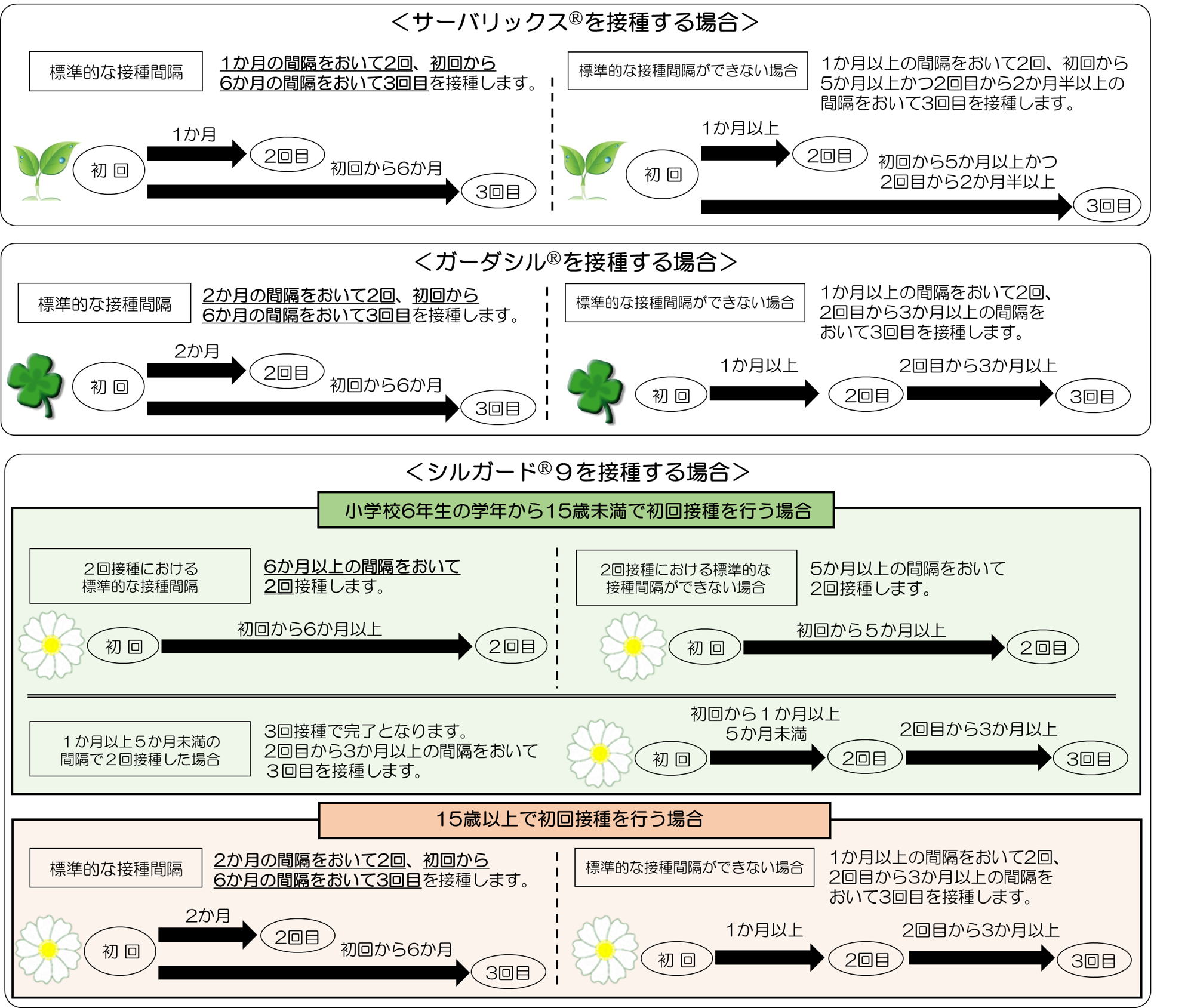 注:同じ種類のHPVワクチンで規定の回数を接種することが原則ですが、すでに2価ワクチンまたは4価ワクチンを用いて1回目ないし2回目を接種した者が残りの回数を行う場合には、医師とよく相談した上で、9価ワクチンを選択しても差し支えありません。