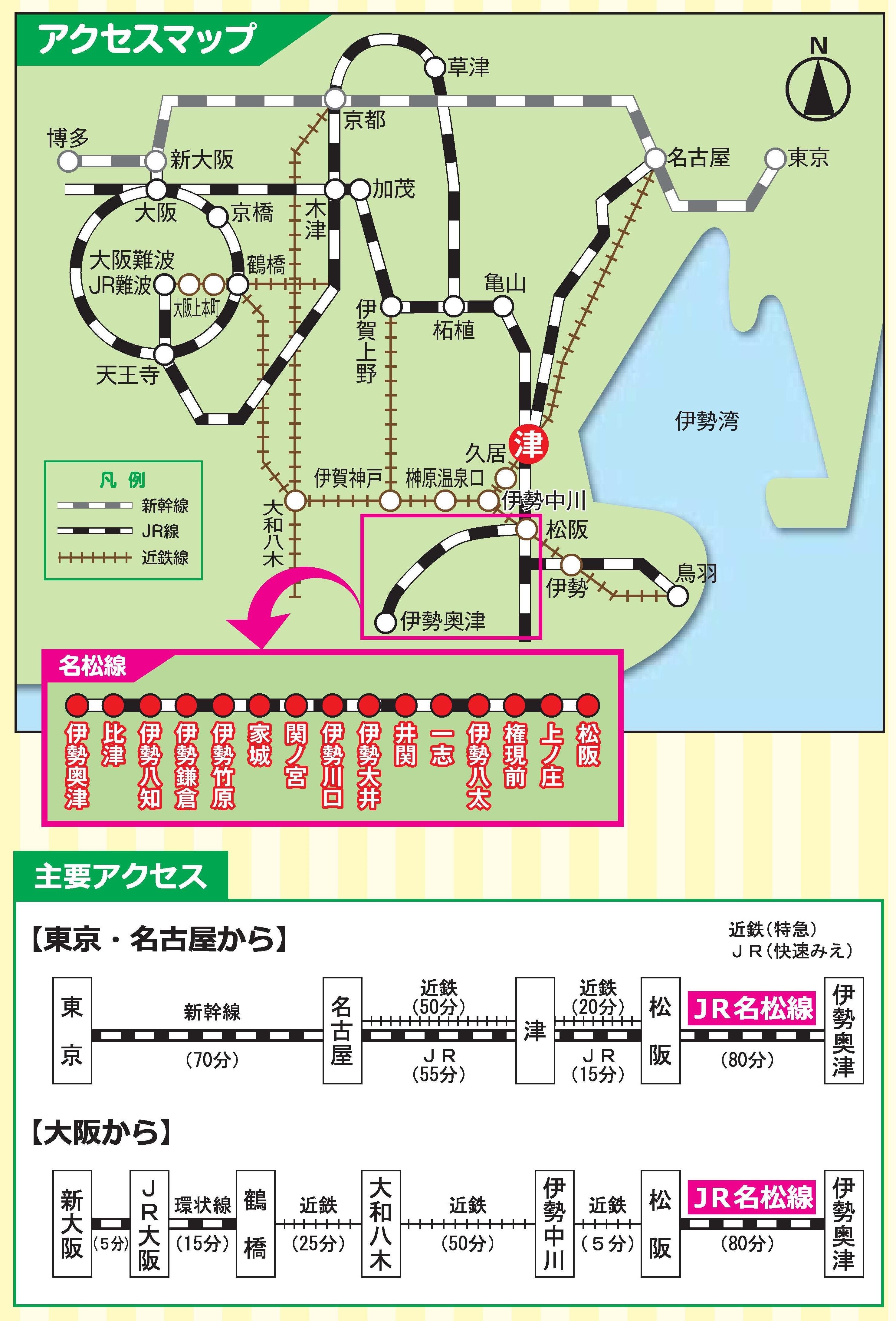 近鉄津駅→(15分)→近鉄伊勢中川駅→(5分)→近鉄川合高岡駅→(徒歩8分)→JR一志駅→(65分)→JR伊勢奥津駅
