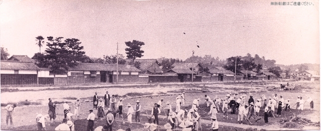 明治期の西堀端武家屋敷。手前は師範学校の敷地で、農作業にいそしむ学生たちの姿が見えます。外堀が埋められて間もない頃で、そのあとがよく判ります。