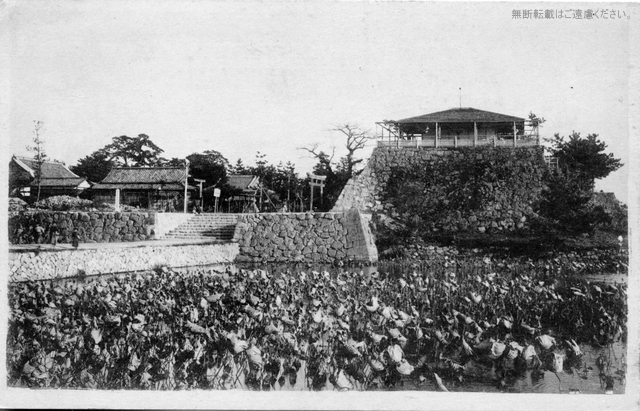大正期の津城本丸。内堀は蓮池と言われるほどに蓮が繁茂してます。天守台の上には東屋が設けられ、展望所となっていました。本丸内には高山神社がありました。