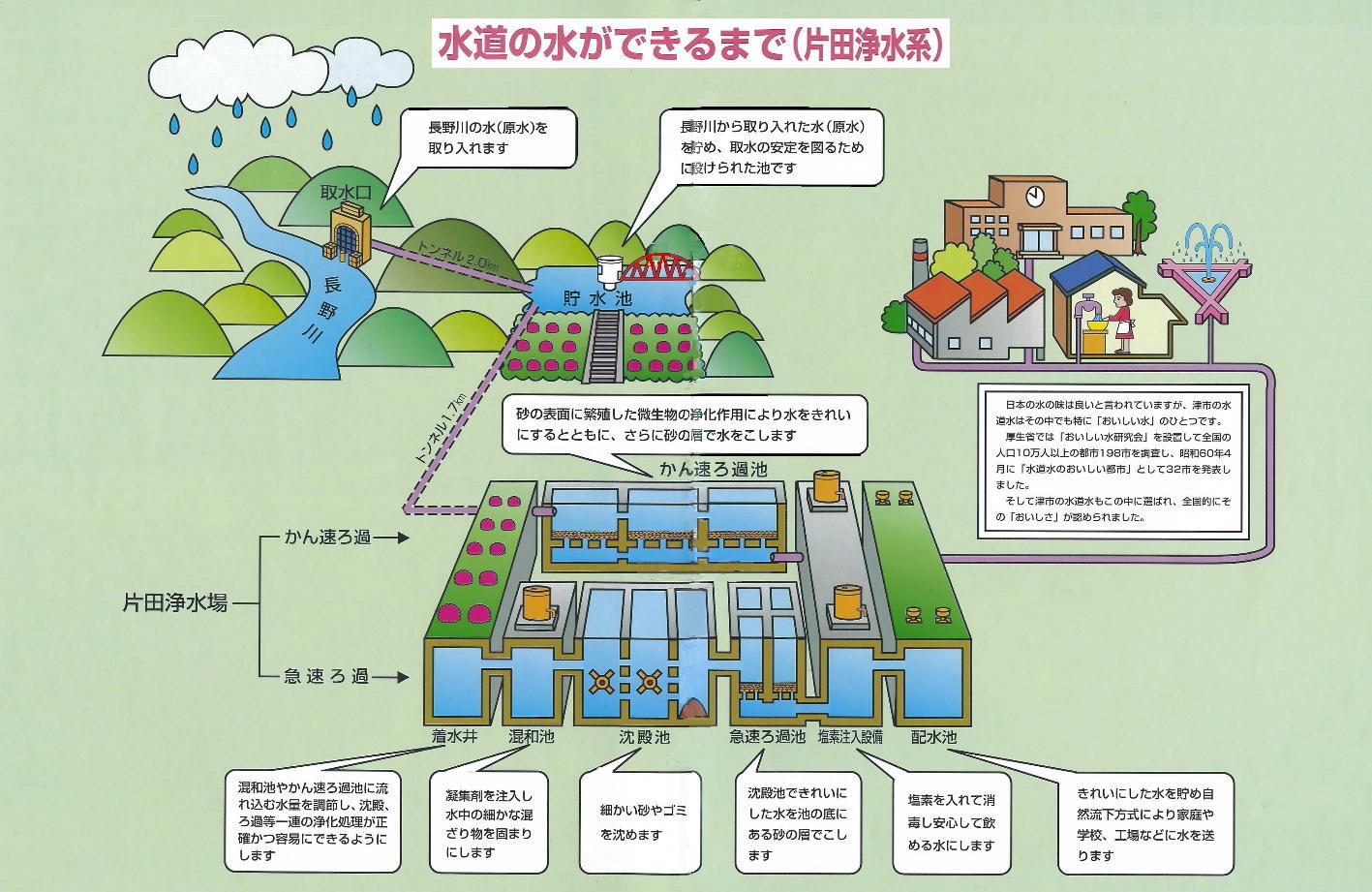 津市の上水道は、自己水源の浄水場(27カ所)で浄水処理した水と県営水道から受水した水を給水しています。浄水処理方式は、かん速ろ過や急速ろ過などそれぞれの水源にあった方法を採用しています。また、配水池は85施設あります。