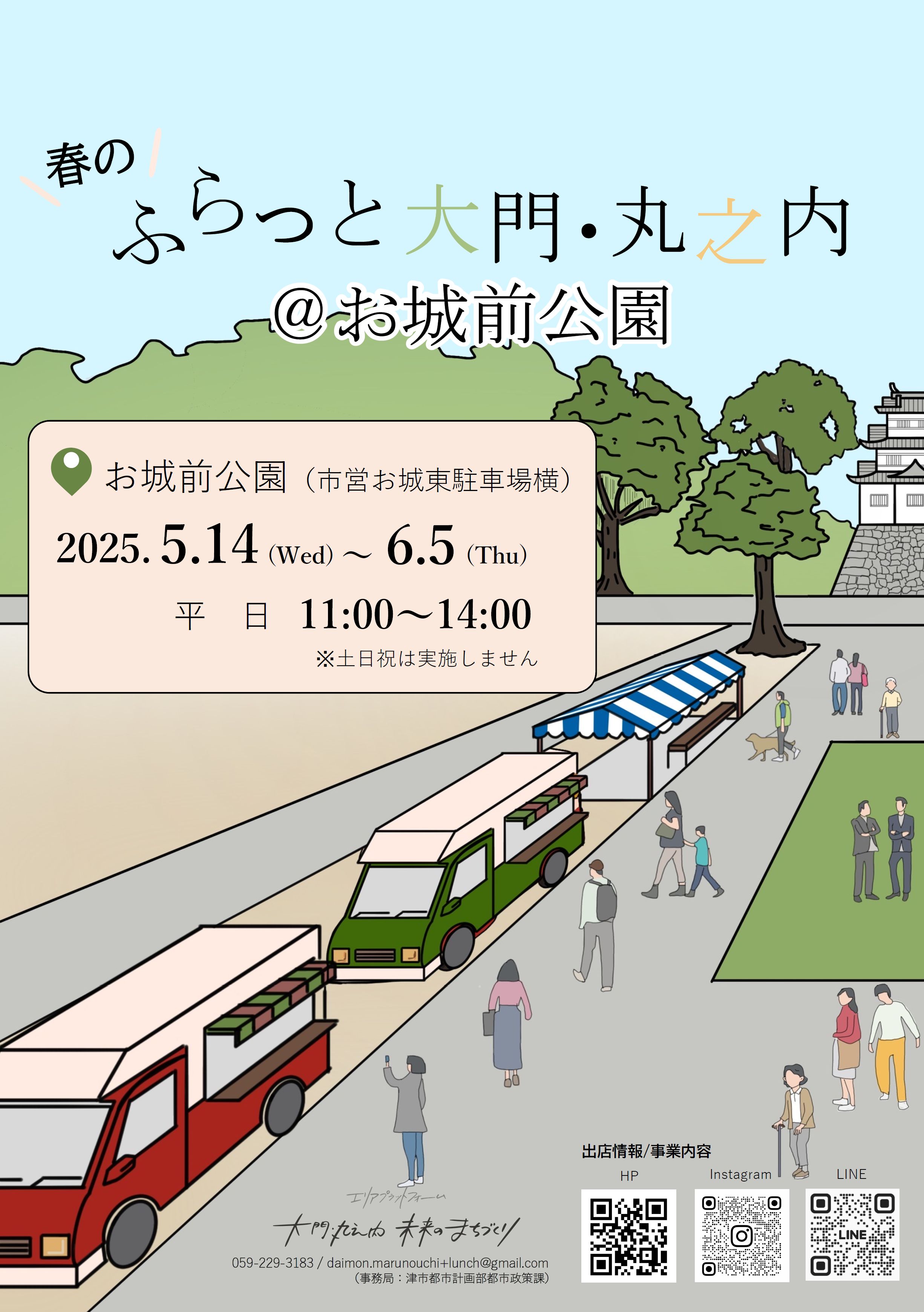 そこで、引き続き恒常的な賑わいを創出するために、5月14日(水曜日)~6月5日(木曜日)まで、春の「ふらっと大門・丸之内@お城前公園」と題し、令和6年度同様、お城前公園にキッチンカーや出店ブースを配置し、テーブルやイスなどを設置することで周辺地区にお勤めの皆様が、ランチタイムにゆっくりと飲食を楽しめる空間を提供します。