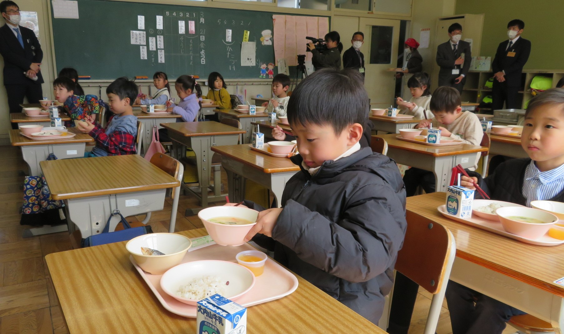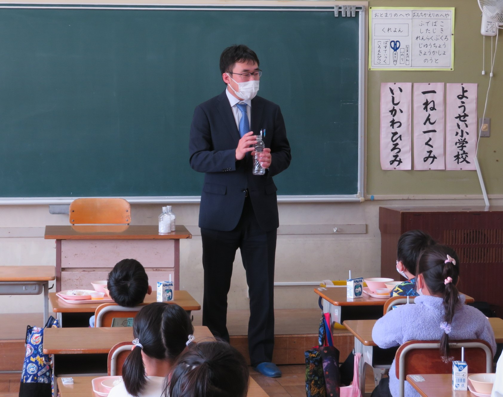 寄贈いただいた食器の使用を開始した養正小学校では、給食前に株式会社おぎそより、食器やペットボトルのリサイクルについてお話いただきました。