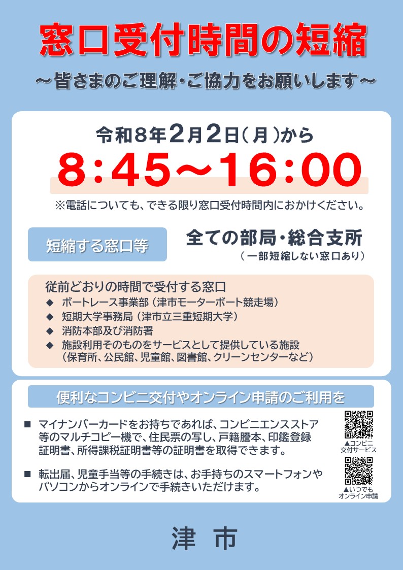 津市では、各種申請のオンライン利用の増加や証明書のコンビニ交付サービスの浸透により、窓口にお越しにならなくても一部手続が可能となる中、職員の働き方改革を推進し、恒常的に発生している時間外勤務の削減、職員一人一人の心身の安定や職務に対する意欲向上及び業務改善を検討する時間を確保することで市民サービスの向上を図るため、窓口受付時間を短縮します。