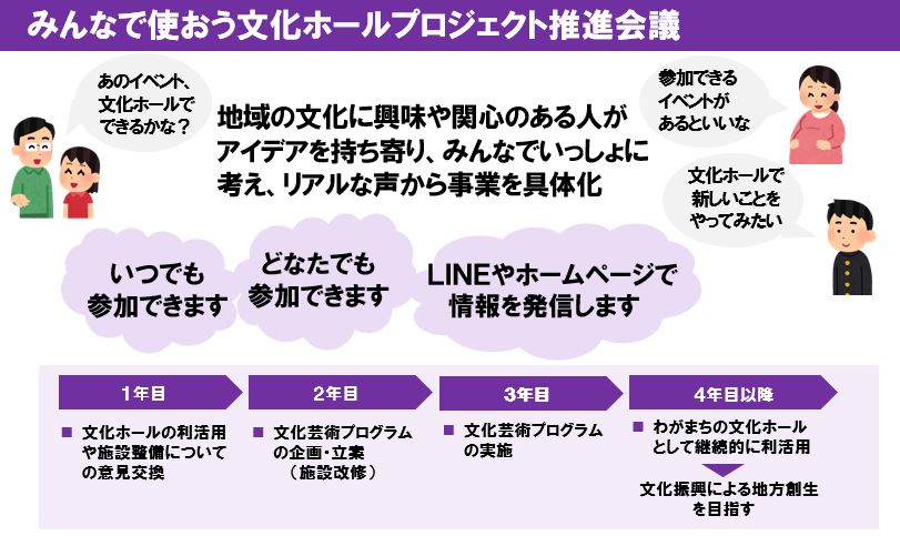 地域に活力と魅力を生み出す文化芸術活動活性化プロジェクト事業の推進体制を「みんなで使おう文化ホールプロジェクト」としました。施設改修・市民芸術活動プログラム両面から文化ホールを再生することで、地域の方々が“わがまちの文化ホール”としての意識を高め、自主的、自立的に利活用することで、文化ホールを拠点とした文化振興による地方創生につなげていきます。