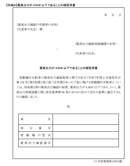 国土交通省が運用する最高出最高出力確認制度に基づいて、確認実施機関が個々の車両ごとに発行する最高出力確認済み証明書(注1)