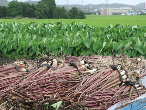 里芋科のハツ頭芋の茎であるずいき。収穫時期が夏の短期間で、季節感を感じられる野菜のひとつです。中でも、美しいあずき色をした芸濃ずいきは、三重の伝統野菜に選定されていて、京料理では不可欠の高級食材となってます。