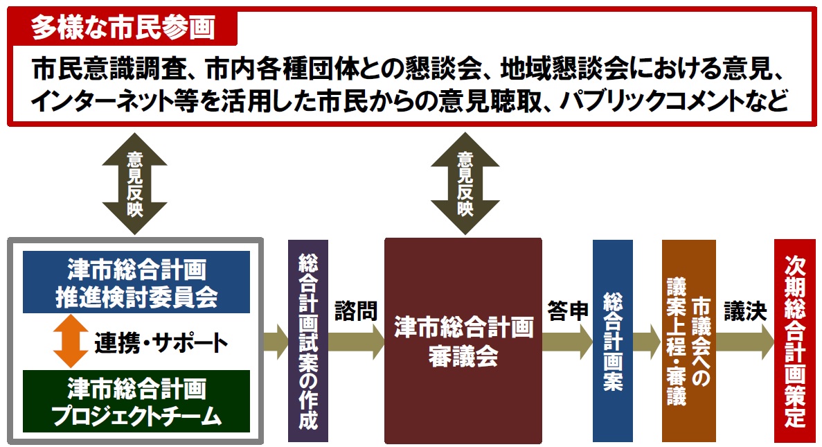 総合計画について調査審議するため、津市総合計画審議会を津市総合計画審議会条例(平成18年9月29日条例第309号)に基づき設置していました。
