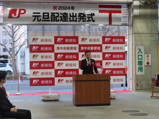 ■津中央郵便局 2024年 年賀郵便元旦配達出発式 挨拶、テープカット(同所)