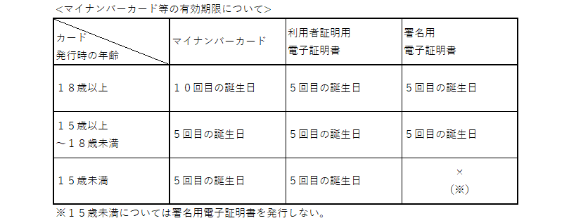 マイナンバーカードの有効期限は、発行日から10回目の誕生日(発行時未成年者は5回目)まで、電子証明書の有効期限は、年齢問わず発行日から5回目の誕生日までに設定されています。